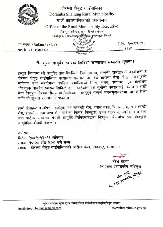 » निःशुल्क आयुर्वेद स्वास्थ्य शिविर संञ्चालन सम्बन्धी सूचना