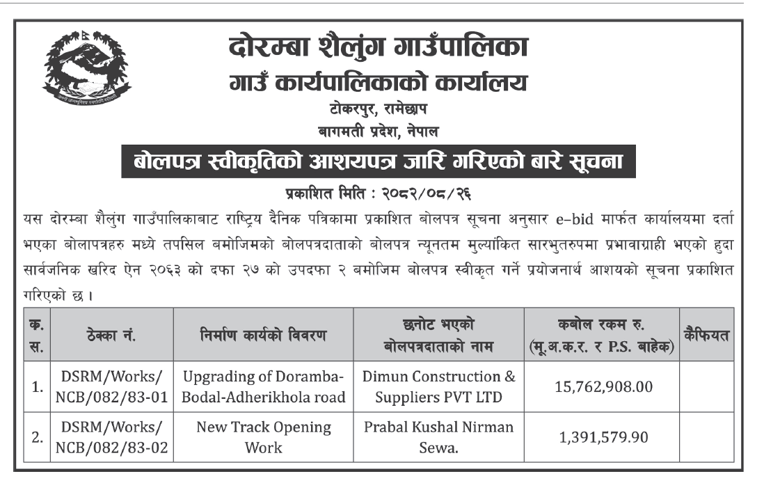 » बोलपत्र स्वीकृतिको आशयपत्र जारि गरिएको बारे सूचना