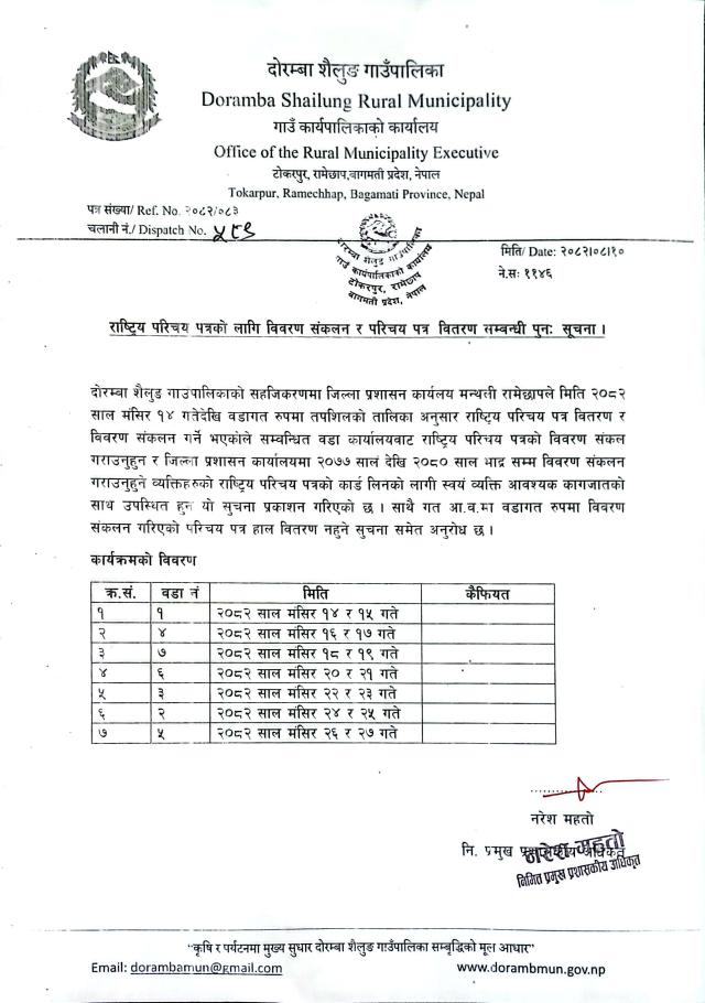 » राष्ट्रिय परिचय पत्रको लागि विवरण संकलन र परिचय पत्र वितरण सम्बन्धी सूचना ।