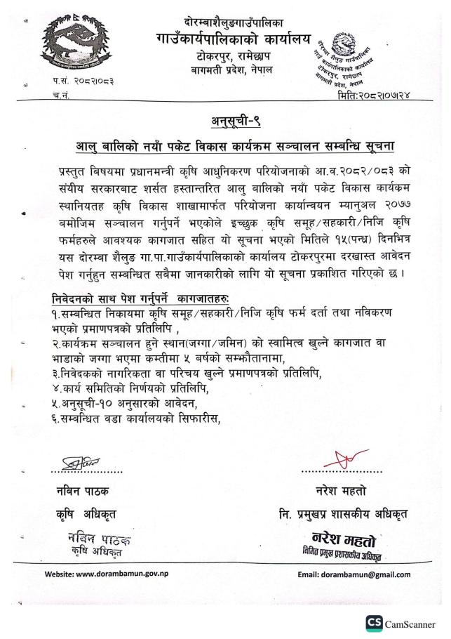 आलु बालिको नयाँ पकेट विकास कार्यक्रम सञ्चालन सम्बन्धि सूचना