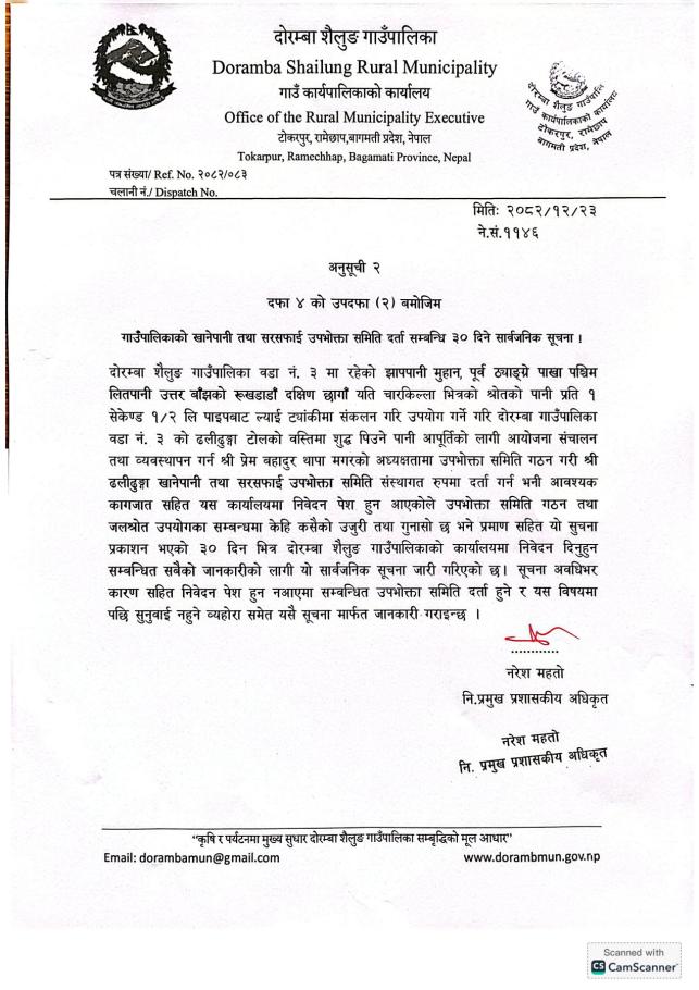 ढलीढुङ्गा खानेपानी तथा सरसफाई उपभोक्ता समिति दर्ता सम्बन्धि ३० दिने सार्वजनिक सूचना ।