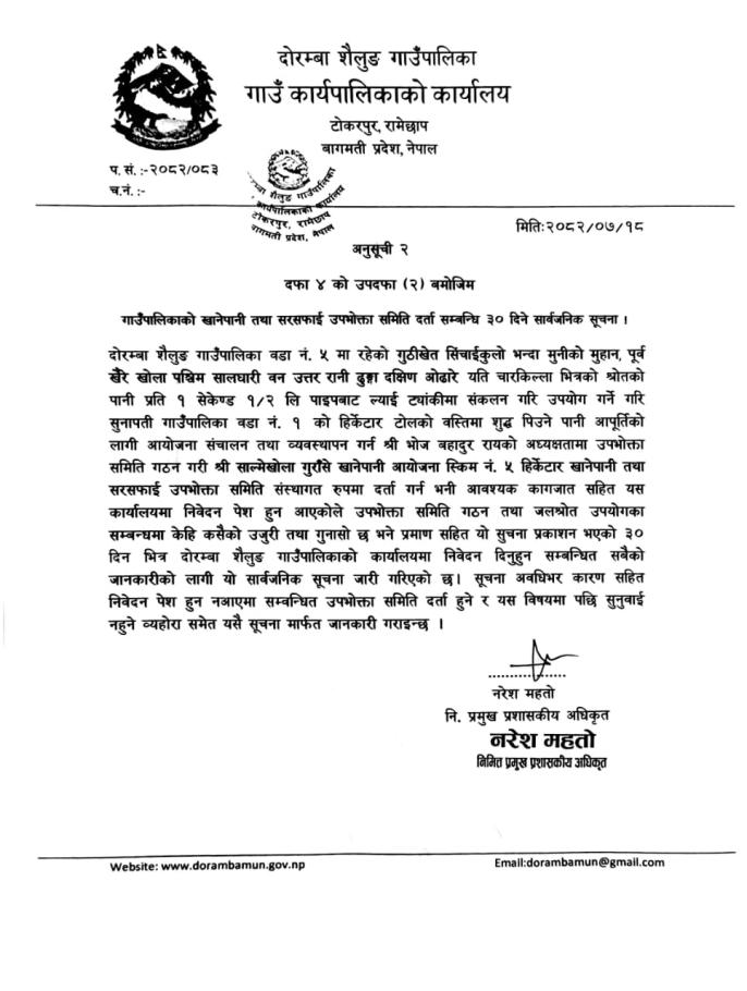 साल्मेखोला गुराँसे खानेपानी आयोजना स्किम नं. ५ हिर्केटार खानेपानी दर्ता सम्बन्धि ३० दिने सार्वजनिक सूचना ।